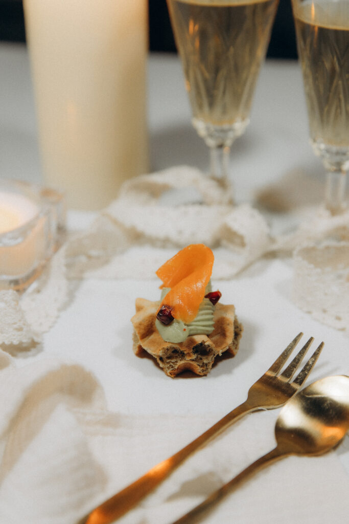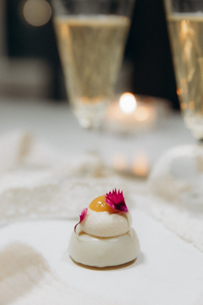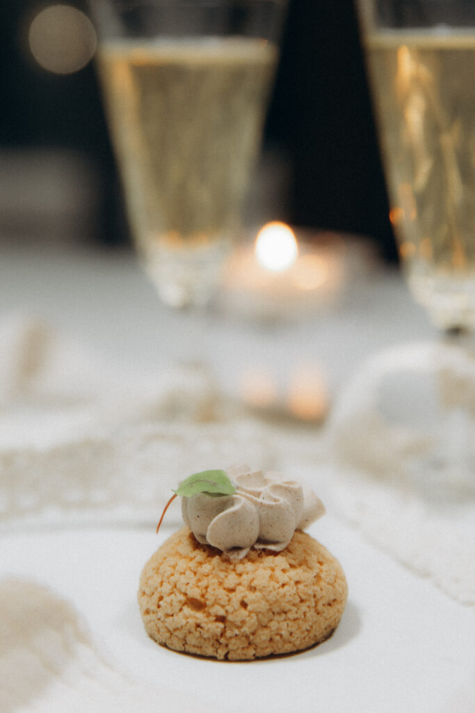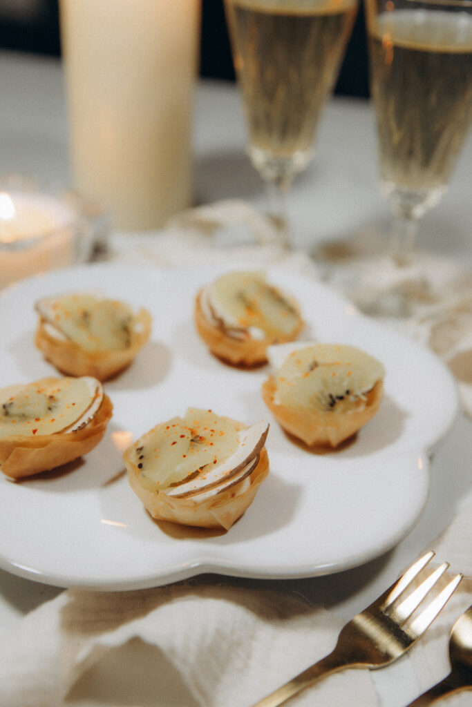 Tartelette fromage frais fouetté citron, champignons, kiwi jaune, piment d’Espelette