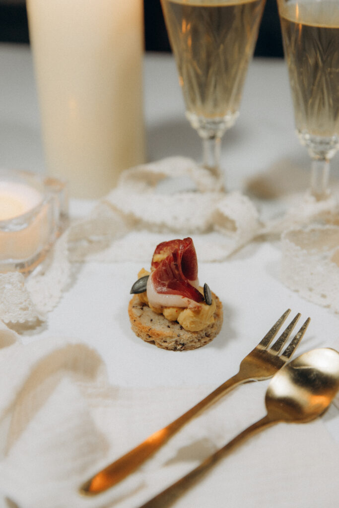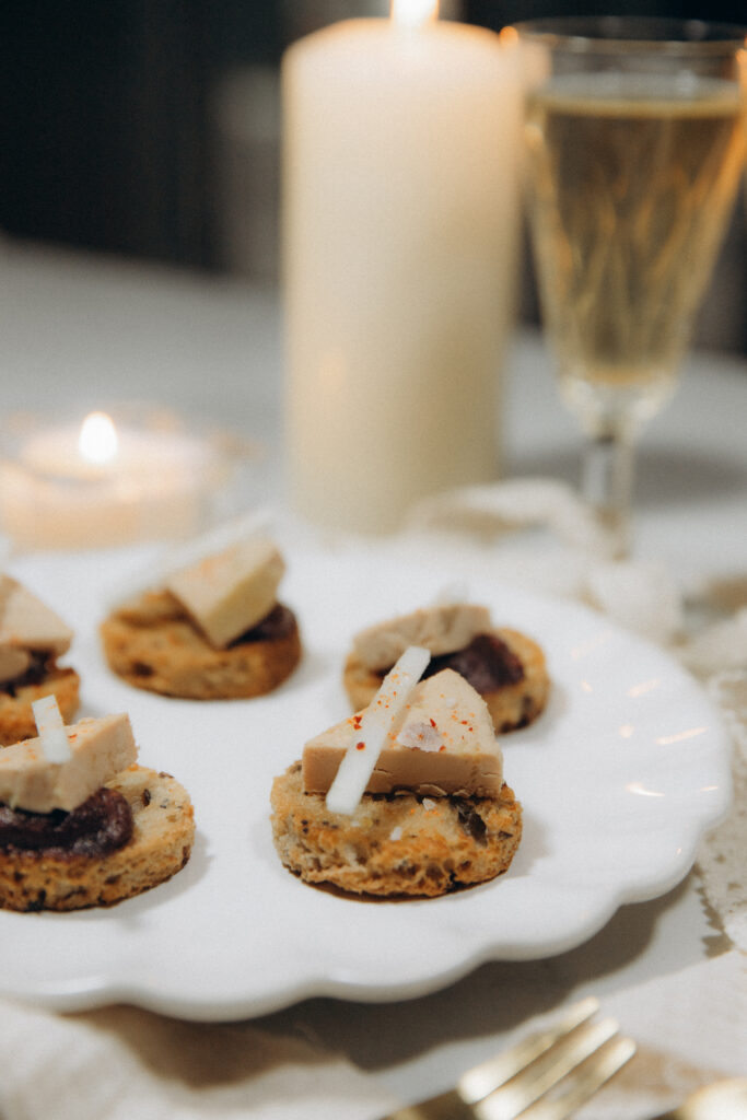 Toast foie gras, moutarde de violette, carpaccio de pomme granny