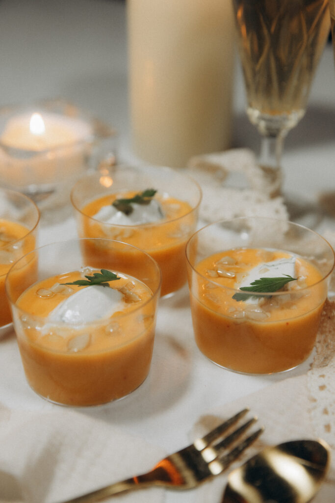 Velouté butternut piment d’Espelette, crème aux herbes, cacahuètes salées