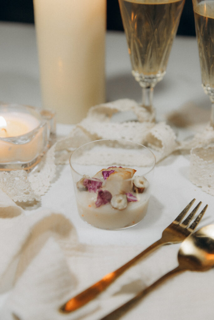 Crème chou-fleur, st jacques snackée beurre noisette, huile noisette